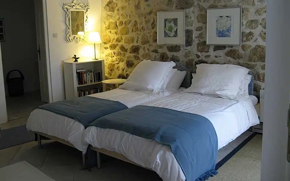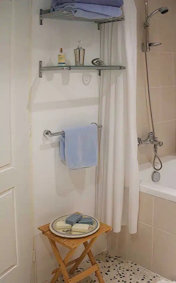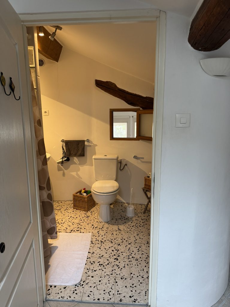 Even with the address in hand, I walked right past it—the entrance is subtly tucked back from the road, offering a sense of seclusion right from the start. The foyer isn’t your typical entryway either; it feels more like a quiet invitation to explore, with each door hinting at something special beyond. With great anticipation, I opened the first door, stepping into a spacious bedroom with cheerful yellow and blue Provençal accents, joined by an ensuite bath. Continuing around the circular hallway (so fun and unexpected!) I discovered a WC and then another large bedroom (in Provençal blue this time) with another ensuite bath.