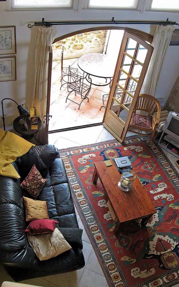Finally I ascended the spiral staircase to explore the main living area. It is both spacious and cozy, thanks to the contrast of high ceilings, large picture windows and grandiose doors anchored by a vast textured stone wall and cozy furnishings. The luminous kitchen feels like something right out of a French decor magazine.