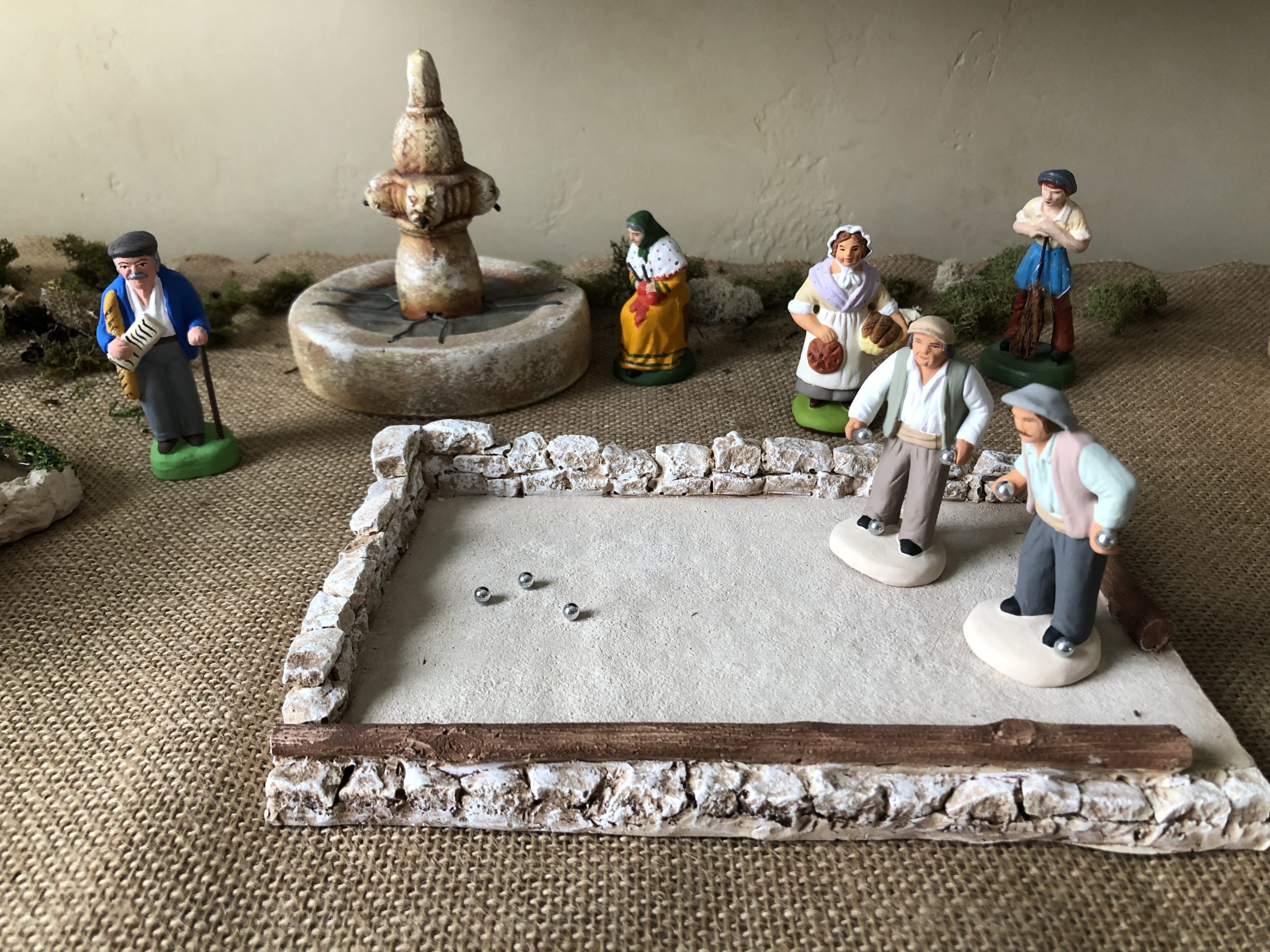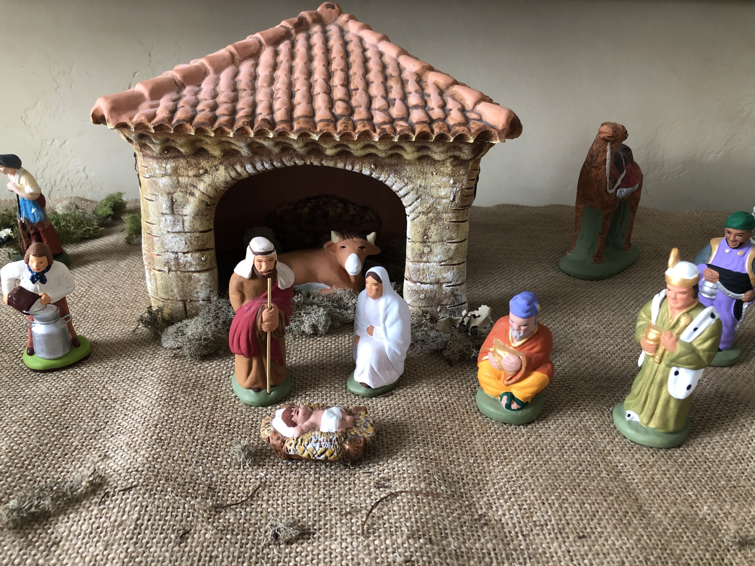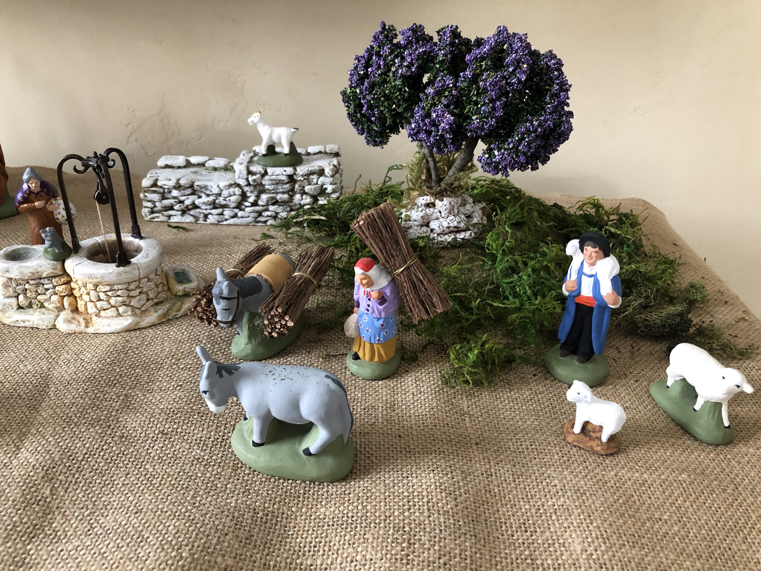 There are no hard and fast rules to creating la crèche – let your creativity flow! They are made up of 3 parts: the Sainte Famille and the stable, the countryside filled with townspeople and animals, and the backdrop – usually featuring a star and the night sky or the countryside in the distance. It has become a collectors paradise to add new features every year. I started my collection about 20 years ago from a santonnier in the small village of Séguret. There are stalls and stalls of different santons from which to choose at the Christmas market in Aix-en-Provence. I have to say it is a joy every year to unwrap each townsperson, goat, fountain and lavender tree, and reassemble the scene for the season. Over the years I have gotten more creative with my display, adding some elevation (clay underneath my runner) and scattering a mossy mixture I found at Michael’s craft store.