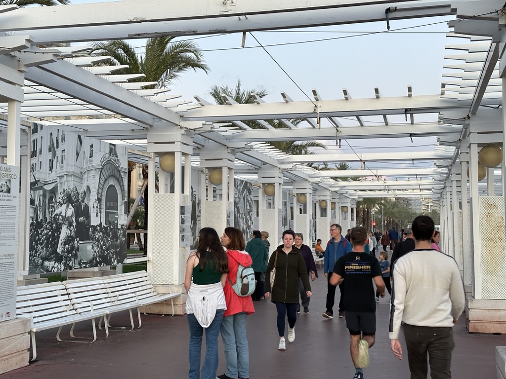 It is time for me to enter the stage.  Am I an actor in someone else’s show?  I step into my sneakers and head down to the famous Promenade des Anglais, the “Prom”.  People have come from each quartier and the show is in full swing.  I walk behind the people seated in the iconic “chaises bleues” and smell a fresh croissant that makes my mouth salivate.  A scooter whizzes by, the businessman dressed in a neat black suit.  He is followed by a larger group of cyclists wearing bright blue jerseys.    A pilates group has settled in on the galets.