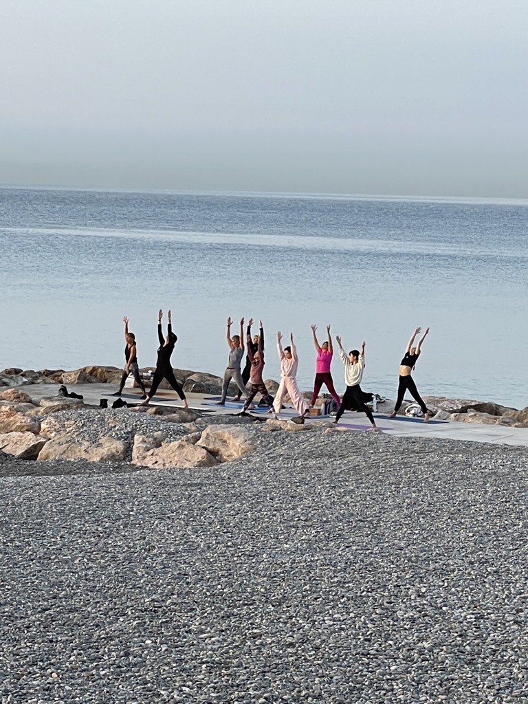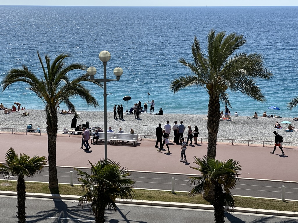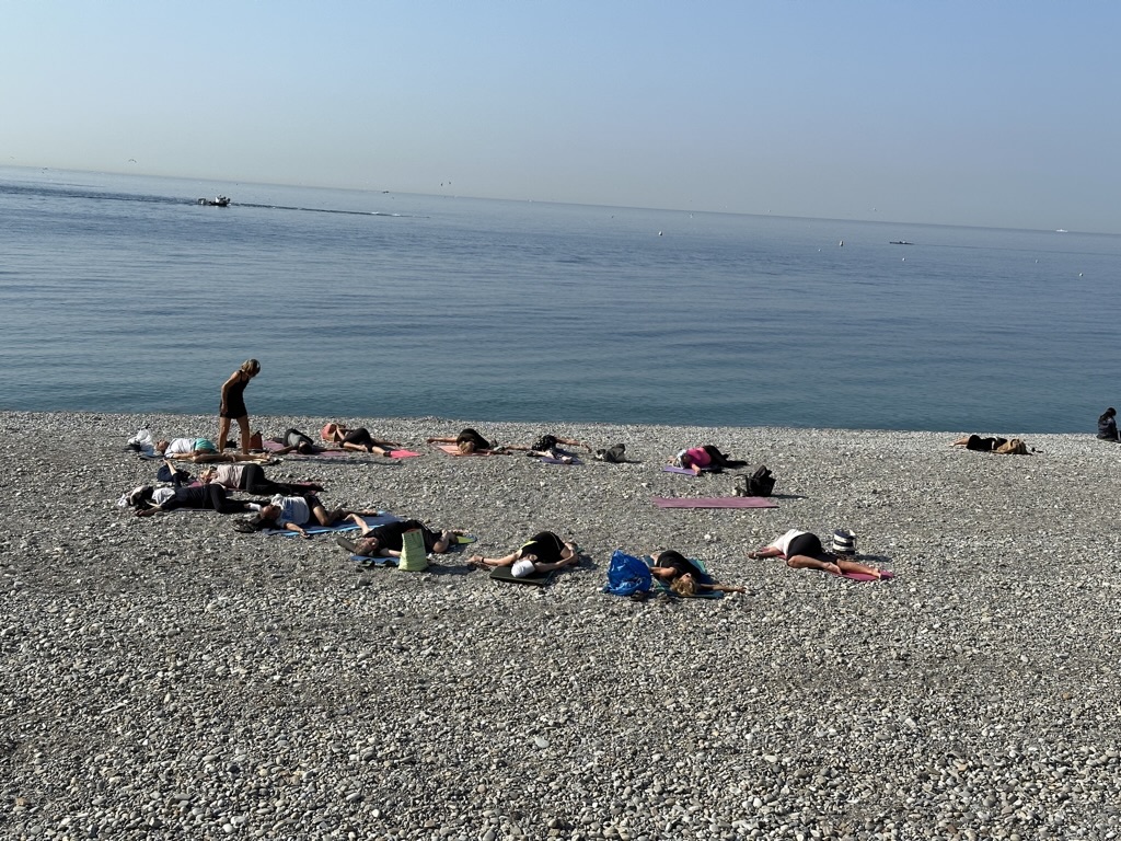 It is time for me to enter the stage.  Am I an actor in someone else’s show?  I step into my sneakers and head down to the famous Promenade des Anglais, the “Prom”.  People have come from each quartier and the show is in full swing.  I walk behind the people seated in the iconic “chaises bleues” and smell a fresh croissant that makes my mouth salivate.  A scooter whizzes by, the businessman dressed in a neat black suit.  He is followed by a larger group of cyclists wearing bright blue jerseys.    A pilates group has settled in on the galets.