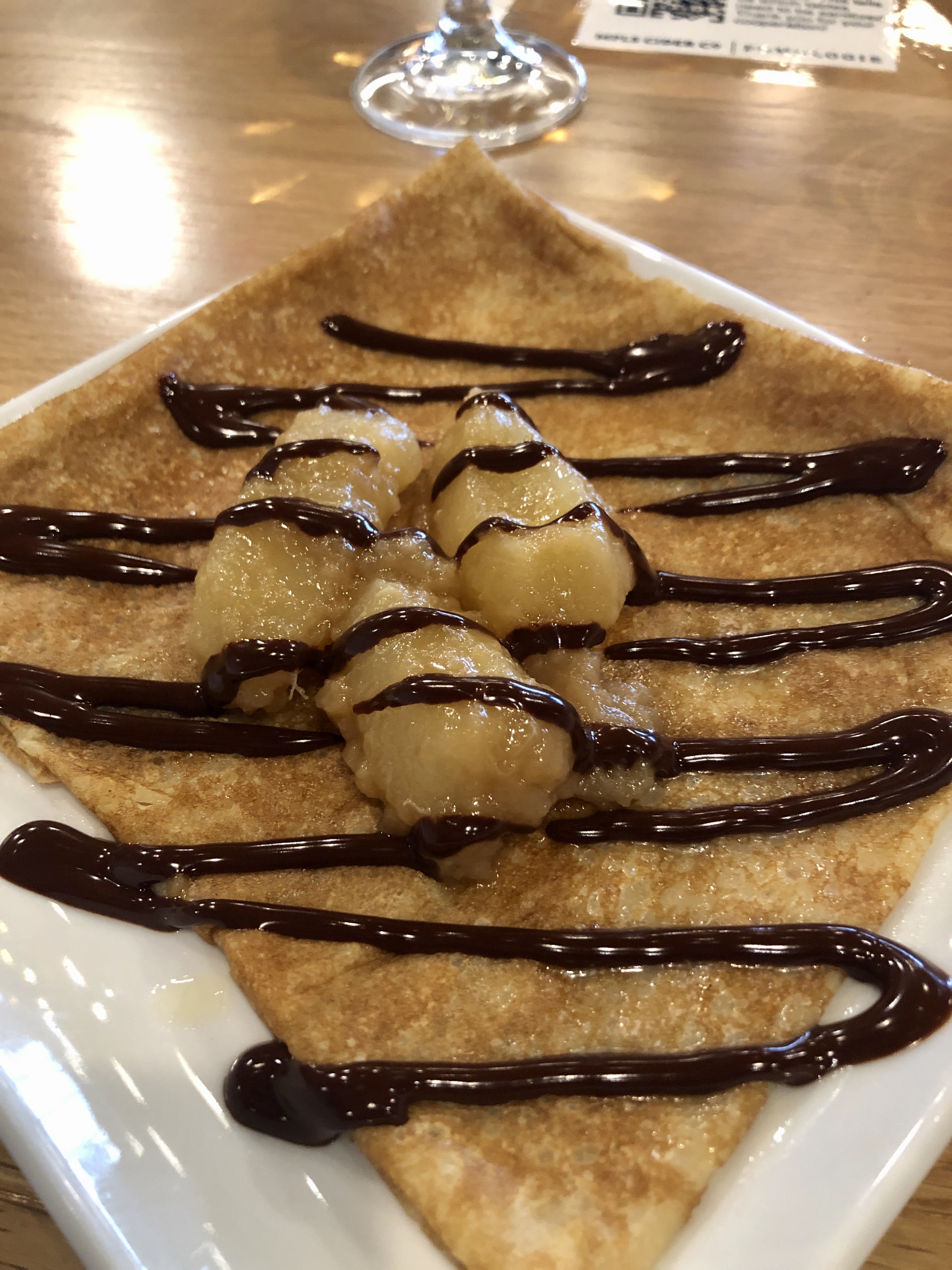 Claire had chosen to share her favorite: Caramelized Pear with dark chocolate ganache (fait maison – homemade!). I knew I would love the crêpe, but when David explained that the cider needed to be dry to balance the sweetness of the crêpe, I admit I thought I may not like the Brut Cider. But it was once again, the perfect pairing! There is no residual sugar in the Brut, but it is crisp and fruity, with hints of pear and melon. I would choose this to drink any time!