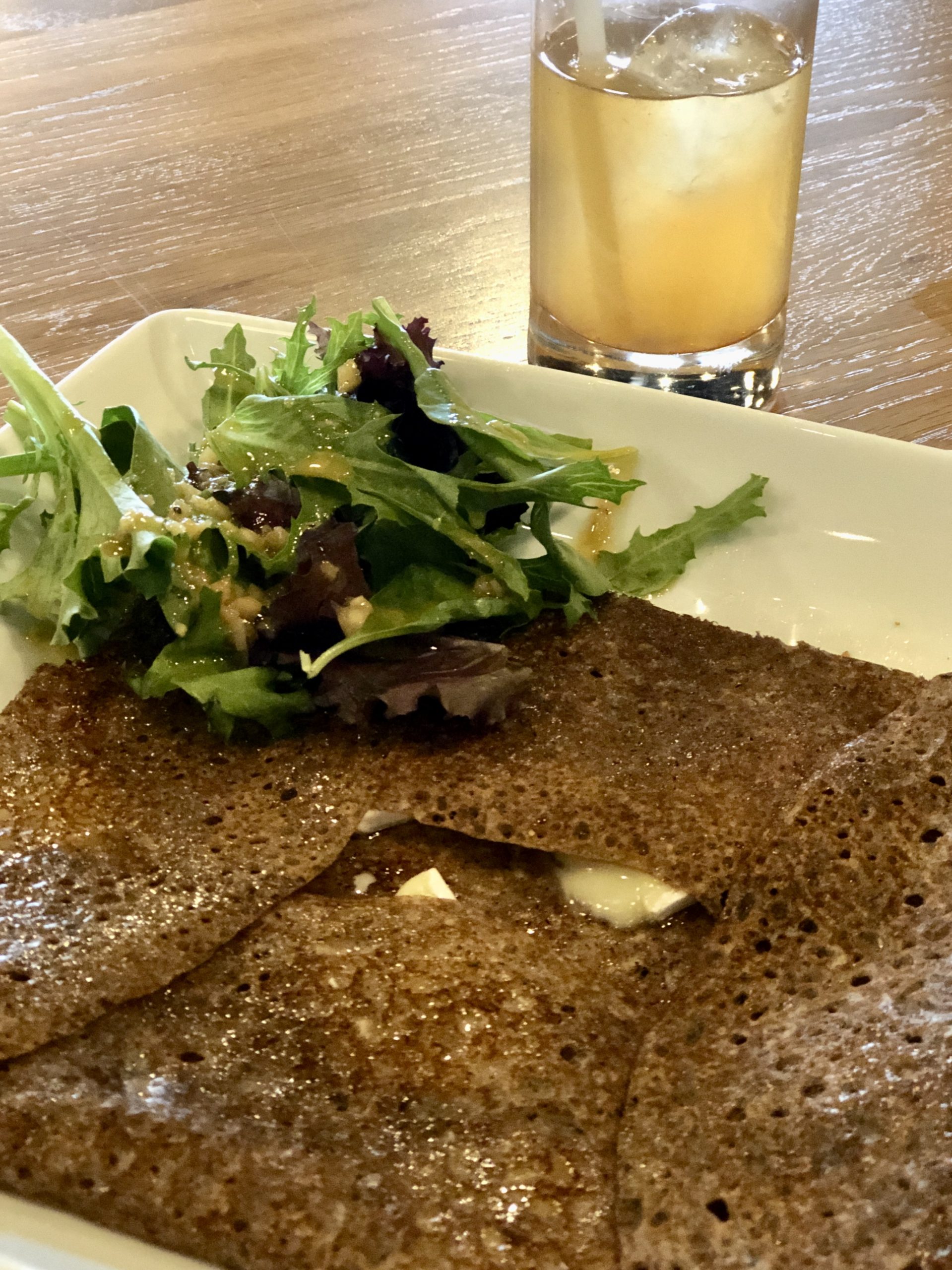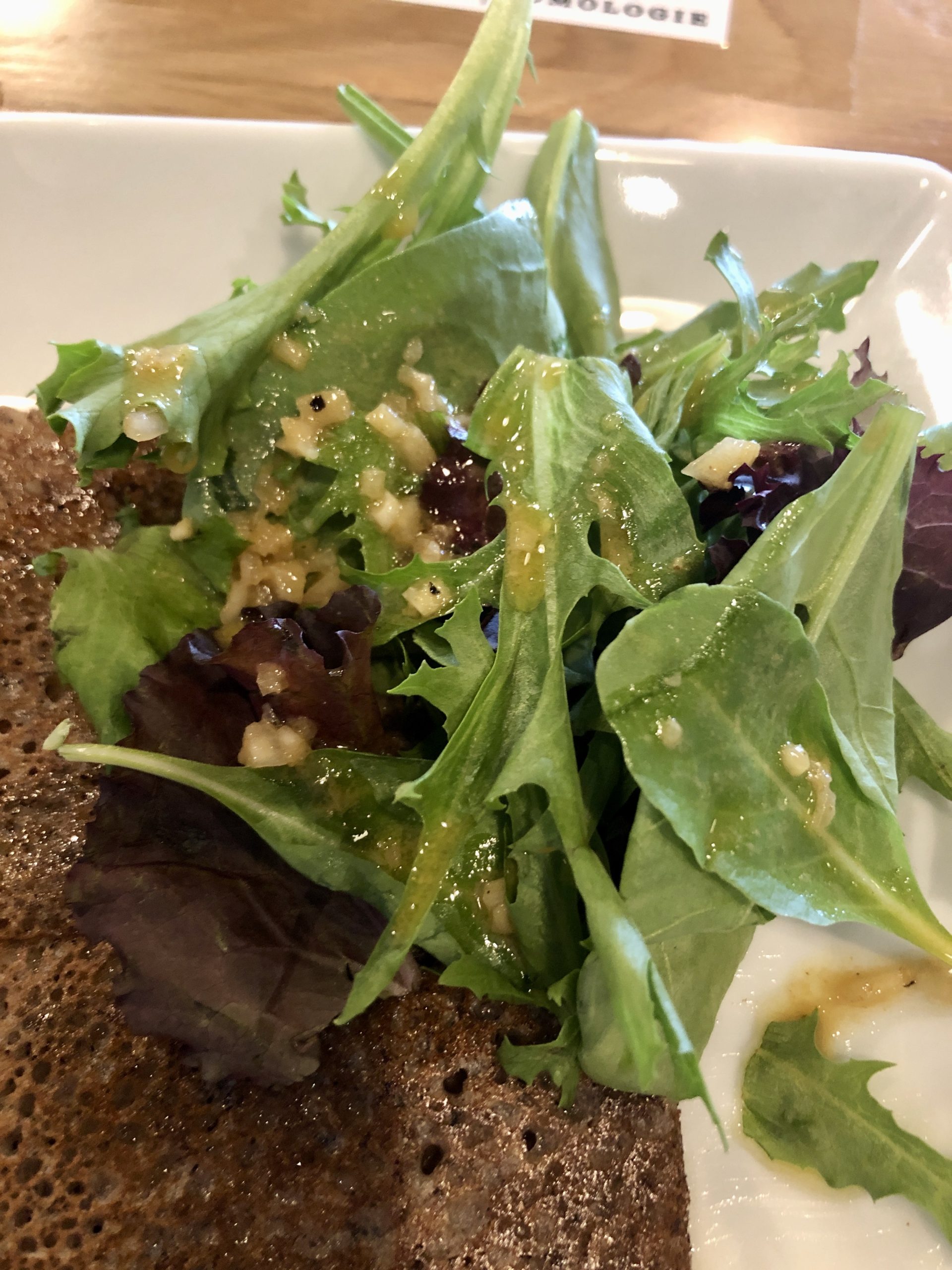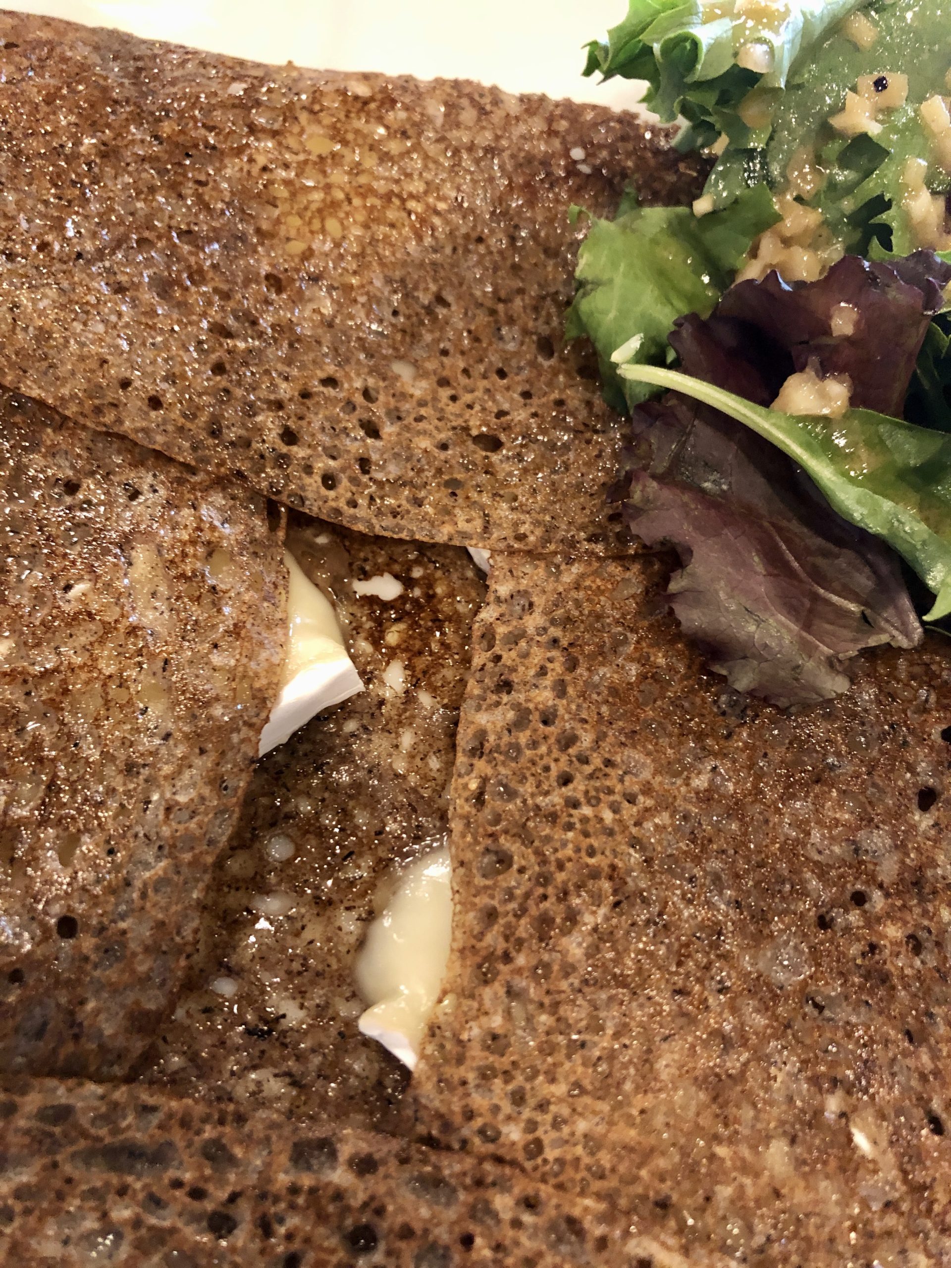 PER-FEC-TION! The galette is light and lacy, melting in your mouth. It’s truly hard to believe that it is made from just buckwheat flour and water. And the combination of the Brie cheese and honey drizzle – sublime. I practically licked the plate clean! The savory crêpes are accompanied by a small side salad – with homemade vinaigrette, of course!