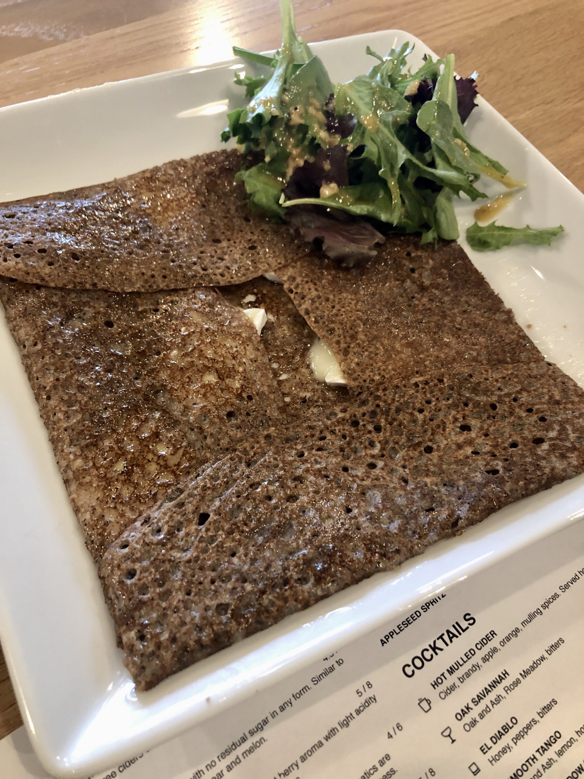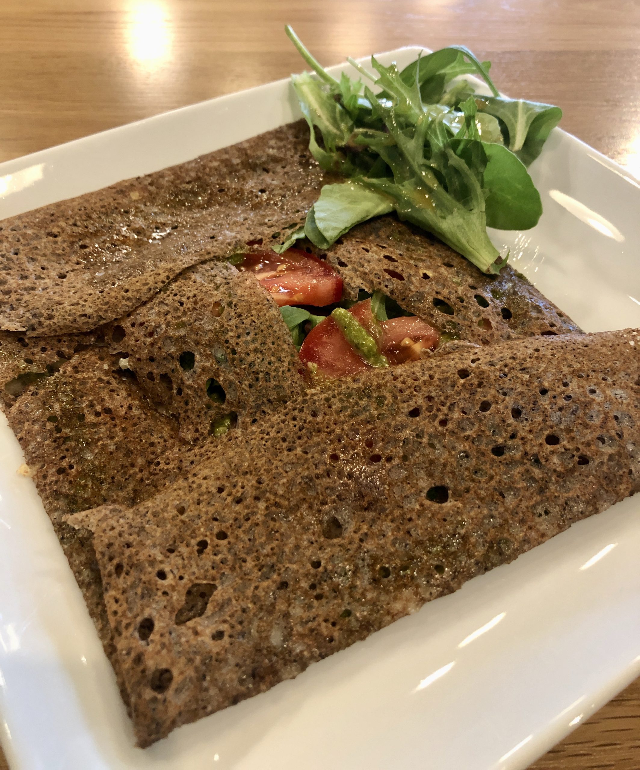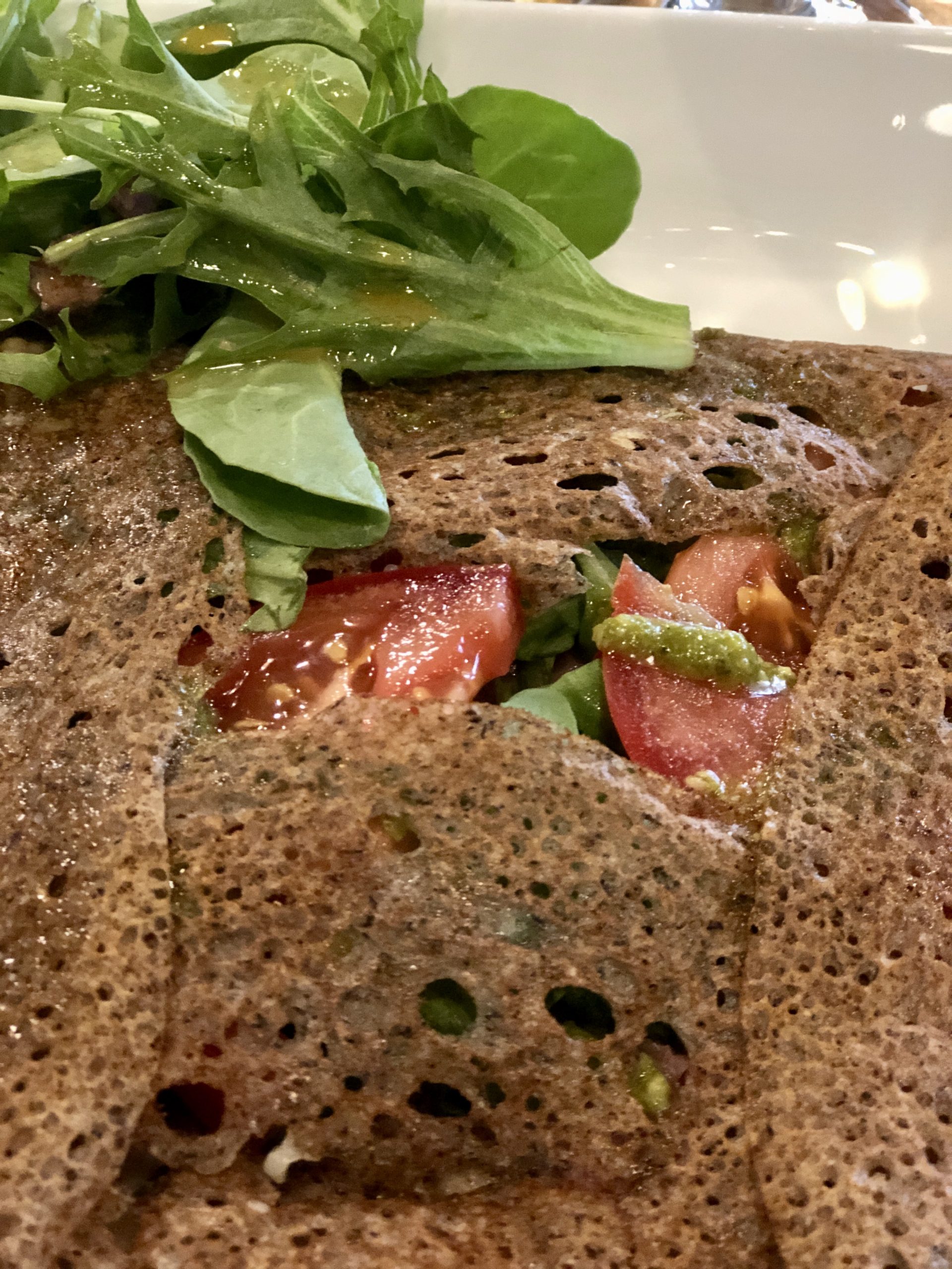 PER-FEC-TION! The galette is light and lacy, melting in your mouth. It’s truly hard to believe that it is made from just buckwheat flour and water. And the combination of the Brie cheese and honey drizzle – sublime. I practically licked the plate clean! The savory crêpes are accompanied by a small side salad – with homemade vinaigrette, of course!