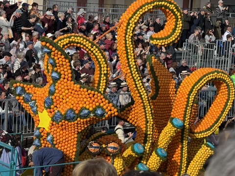 Amazing citrus sculptures line the main square for this festival attracting more than 200,000 visitors per year. Much like Carnaval, a variety of events are spread out over 15 days, including daytime and evening parades. We opted for the first Sunday parade, heeding the advice to get to town before 11 for the 2:30 parade. That gave us ample time to wander the craftsmanship market, where there was everything from lemonade and fresh squeezed orange juice, to the incredible Herbin jams. Every massive sculpture warranted many photos, as they were carefully adorned with whimsical citrus and floral landscapes. It was a bright sunny day, making the colors pop even more. We were able to walk by many of the floats as we made our way to our assigned seats, allowing us even more photo ops.