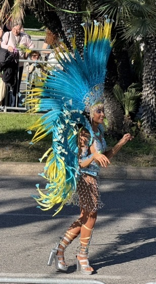 La Bataille de Fleurs takes place during the day, starting at 2:30 pm. There are extravagant costumes, lively music, and enchanting performers that lead the way for charming floats covered in flowers. The first time around a well-behaved crowd waves and sways to the music, but the second time they pass, it is a contest to see who can gather the most impressive bouquets, as flowers are thrown into the audience. As they do this parade 4 times throughout Carnaval, the floats must be re-equipped with flowers each time! It is quite an explosion of color, and we caught it on a perfect, sunny, 60-degree day. Pure bliss. And of course, we proudly brought home our lovely bouquet!