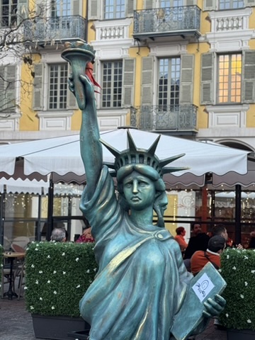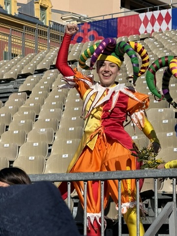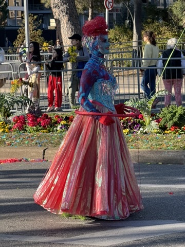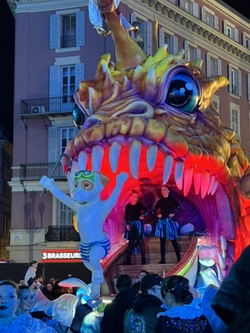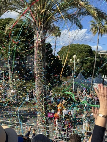 The official kickoff begins at the Maison de Carnaval, where volunteers work all year to create magnificent floats. The floats are massive, and the hangar is too short for the head of the king and queen to be attached inside, so the public gathers to see them in all of their splendor for the first time just outside. There are marching bands and plenty of confetti to mark the occasion as the king and queen are revealed at “Le Grand Charivari”. We made our way to this quartier quite unknown to us, guided by children wearing costumes varying from princesses to dinosaurs. Eventually the floats featuring the King and Queen are brought down and placed on either side of Apollo at Place Masséna, where they watch over the festivities for the duration.