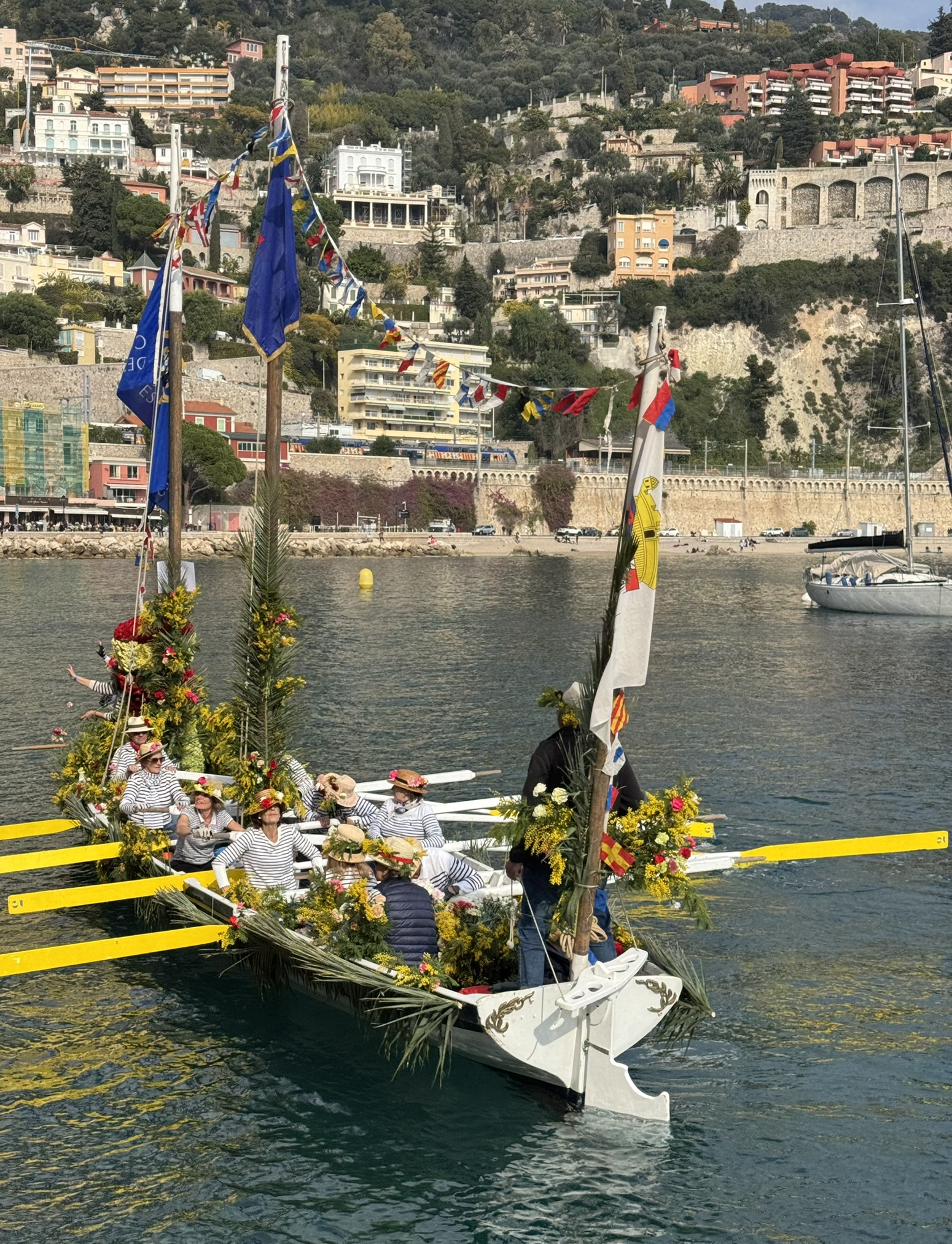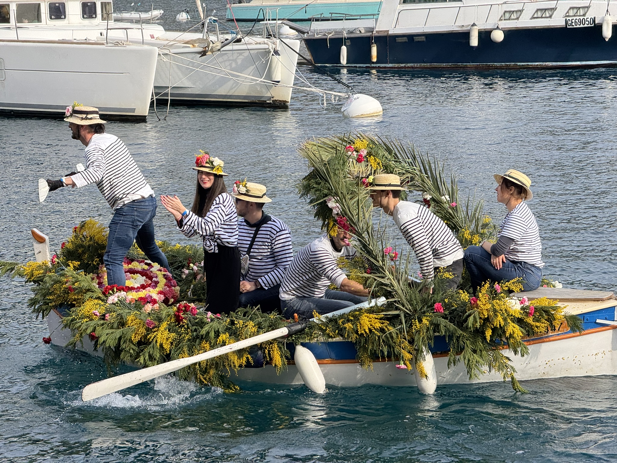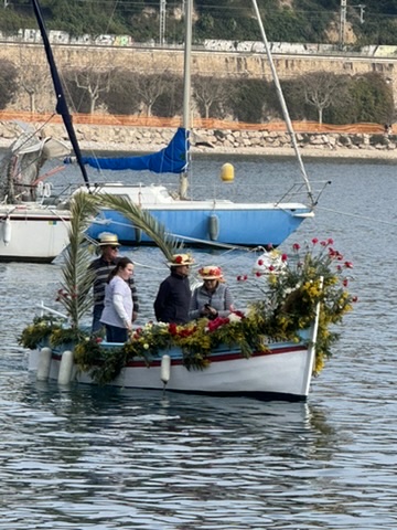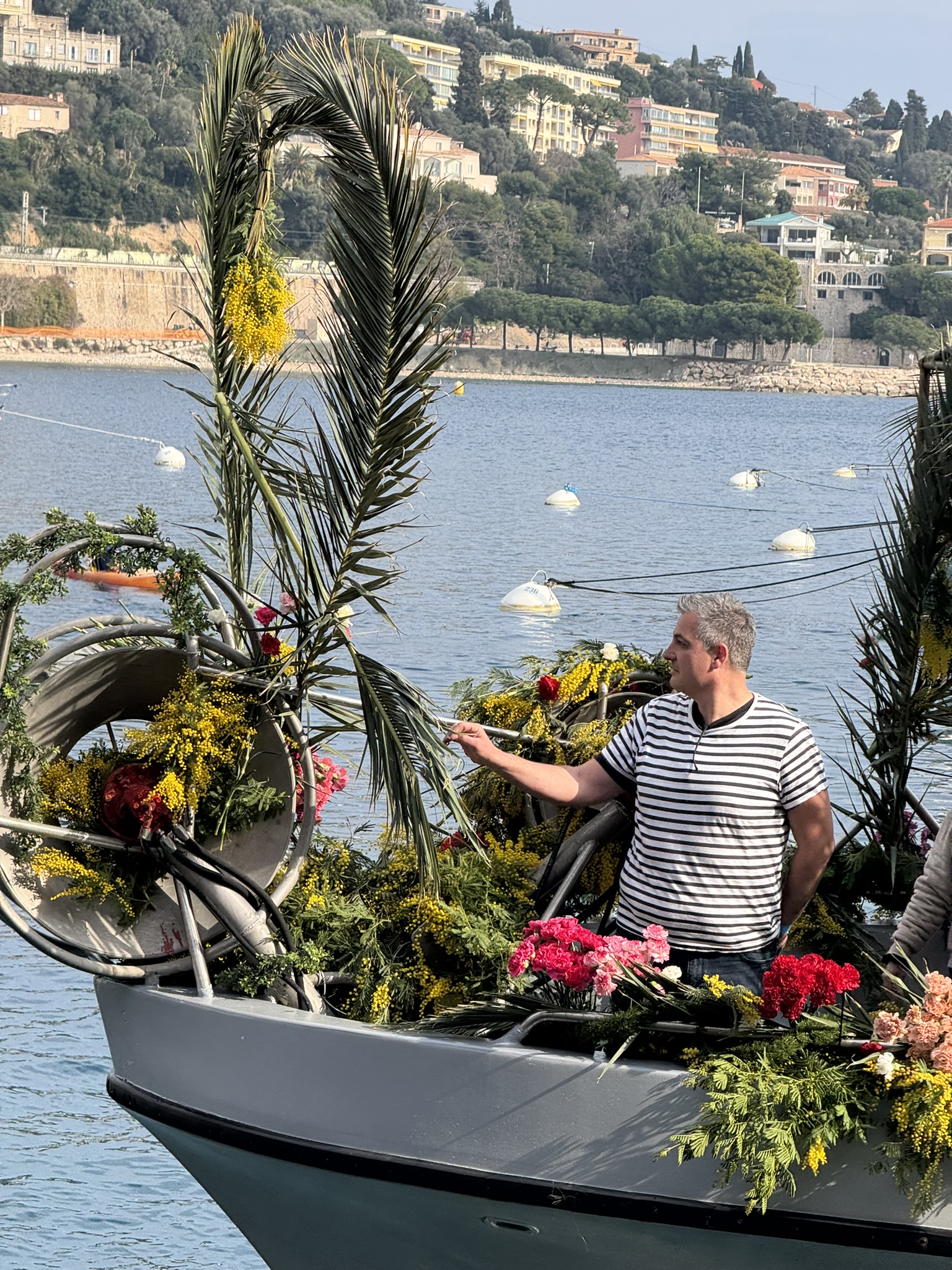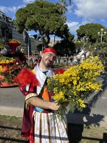 This last event takes place only one day, but it is quite spectacular to attend! Located in the picturesque fishing village of Villefranche-sur-Mer, le Combat Naval Fleuri was held on Monday, February 17th. Fishing boats are completely decked out in an array of flowers, and pass by one-by-one along the coast. The second time around, the mariners, all wearing traditional navy and white stripes, throw flowers out to the most welcoming fans! Far from the fantastic floats and costumed performers of the other festivals, there is something almost poetic about these simple fishing boats, lovingly adorned with the simple beauty of flowers.