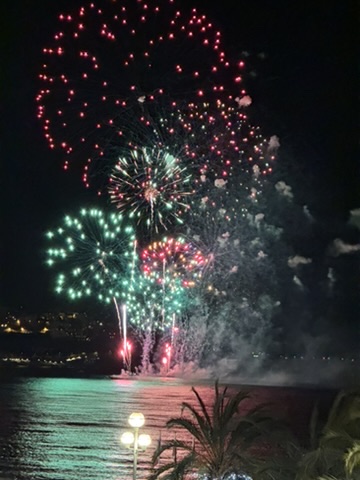 Le Corso Illuminé or Carnival Parade of Lights, takes place in the evening, at 8:30 pm. There are 5 of them, with the final one followed by the “burning of the king” and a huge fireworks display. We chose to attend this one! This time we had standing spots in Place Masséna, so we got there plenty early to secure a spot in the front. The MC is tireless – encouraging the audience to stand, sway and dance. His energy is contagious, as even my husband started chanting “tout le monde, tout le monde, tout le monde” with him! The parade begins, of course with the king, and an explosion of confetti! The colors and lights make each float come alive and the performers are so engaging with spectators – it is truly a party! There is an adorable little boy next to us who seems to be a confetti magnet, and as the crowd is quite closely knit, at one point I realize I have confetti in my mouth!