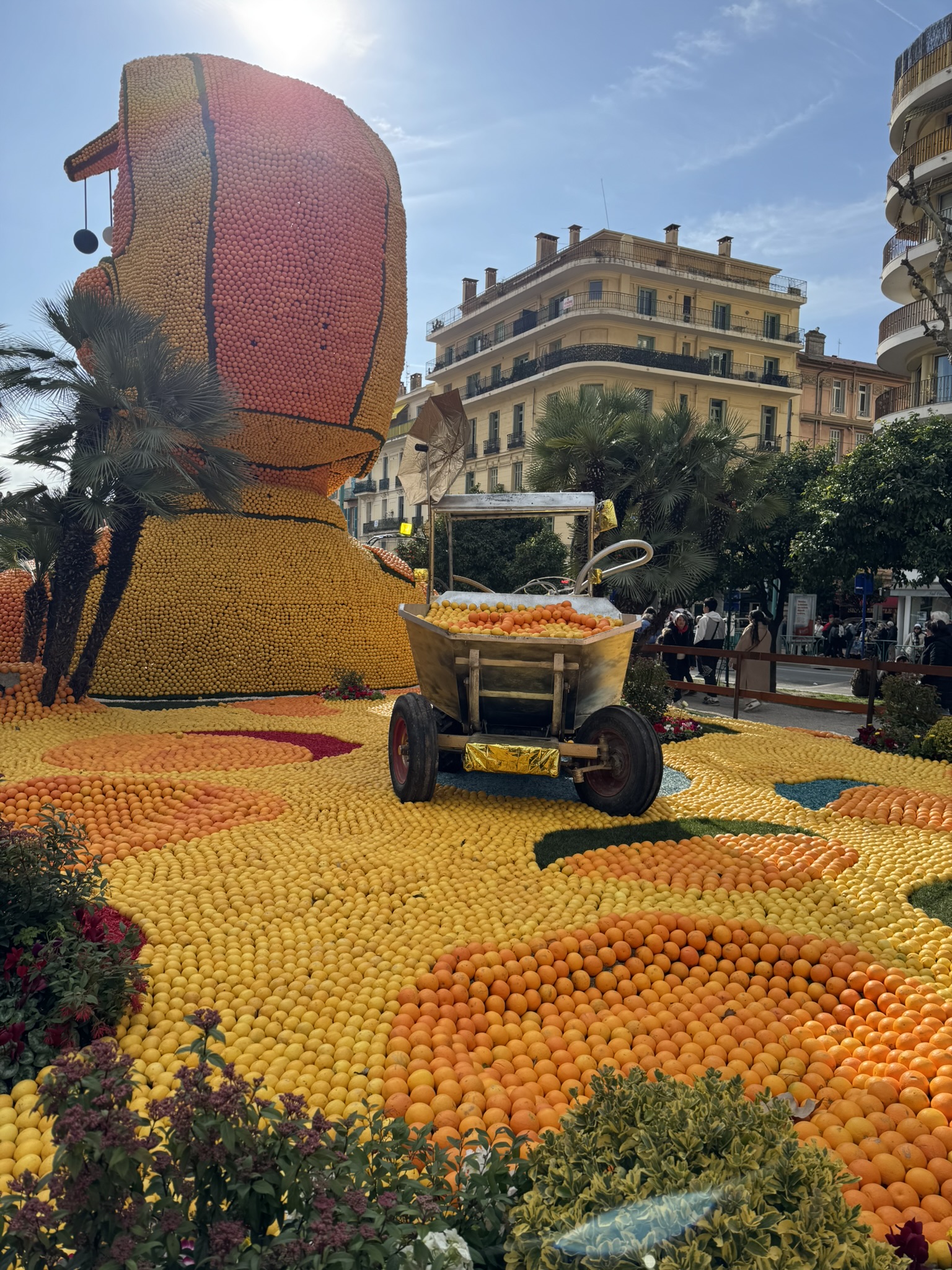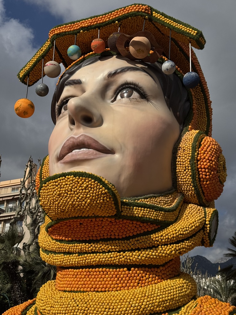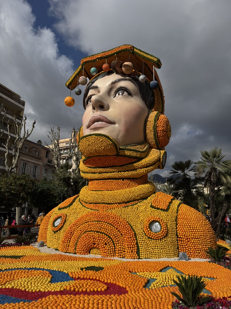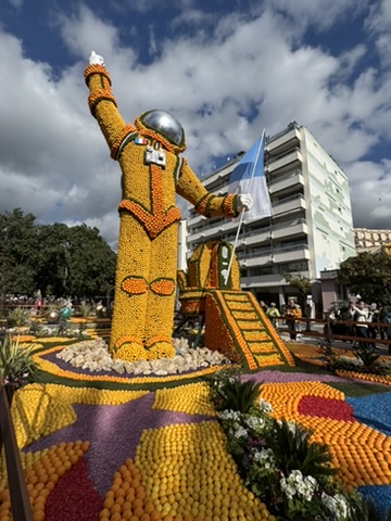 Amazing citrus sculptures line the main square for this festival attracting more than 200,000 visitors per year. Much like Carnaval, a variety of events are spread out over 15 days, including daytime and evening parades. We opted for the first Sunday parade, heeding the advice to get to town before 11 for the 2:30 parade. That gave us ample time to wander the craftsmanship market, where there was everything from lemonade and fresh squeezed orange juice, to the incredible Herbin jams. Every massive sculpture warranted many photos, as they were carefully adorned with whimsical citrus and floral landscapes. It was a bright sunny day, making the colors pop even more. We were able to walk by many of the floats as we made our way to our assigned seats, allowing us even more photo ops.